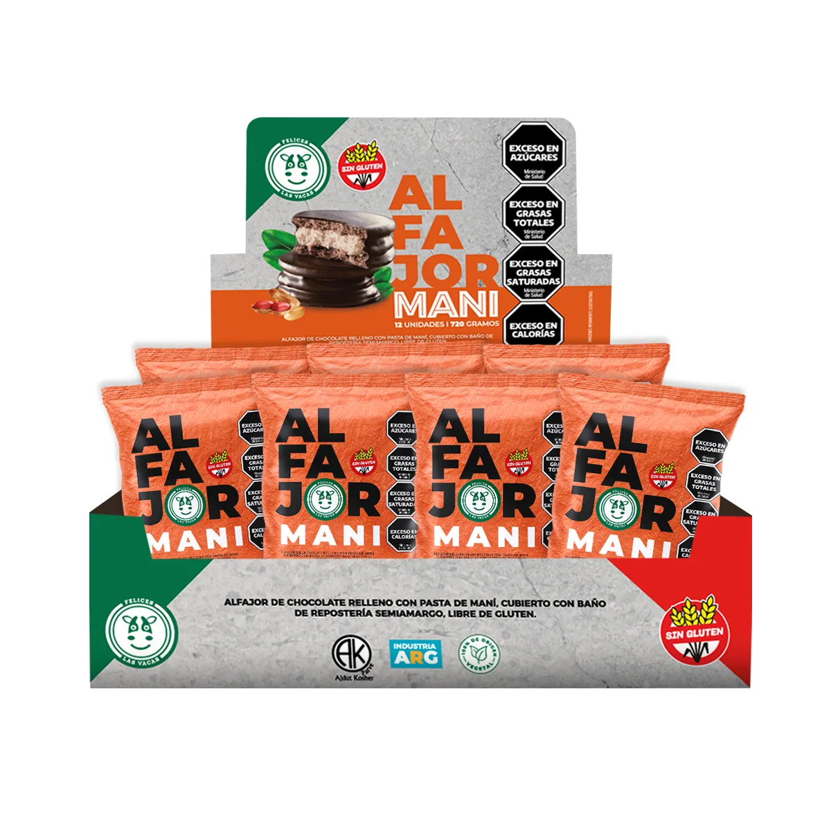 ALFAJOR DE CHOCOLATE RELLENO CON PASTA DE MANÍ, CUBIERTO CON BAÑO DE REPOSTERÍA SEMIAMARGO, LIBRE DE GLUTEN. Trae 12 unidades por caja. (60gr x unidad)